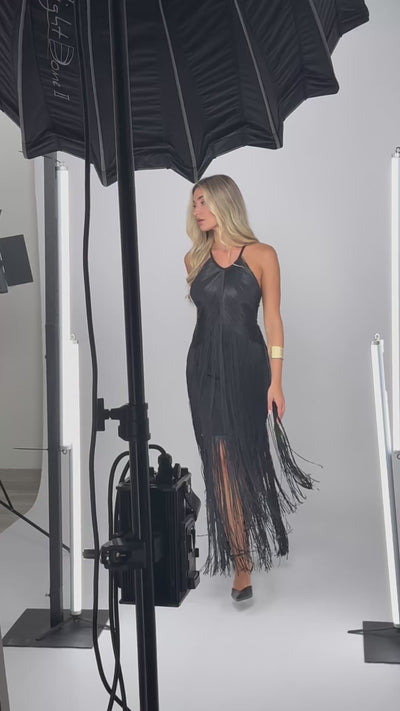 El vestido LYRA está diseñado para capturar todas las miradas con su movimiento hipnótico y su acabado de alta calidad. Confeccionado en un tejido premium con caída satinada, se ajusta al cuerpo con suavidad antes de dar paso a una falda de flecos largos que se deslizan con cada paso, generando un efecto visual impactante y sofisticado. La espalda incorpora una cremallera invisible que garantiza un ajuste limpio y favorecedor.